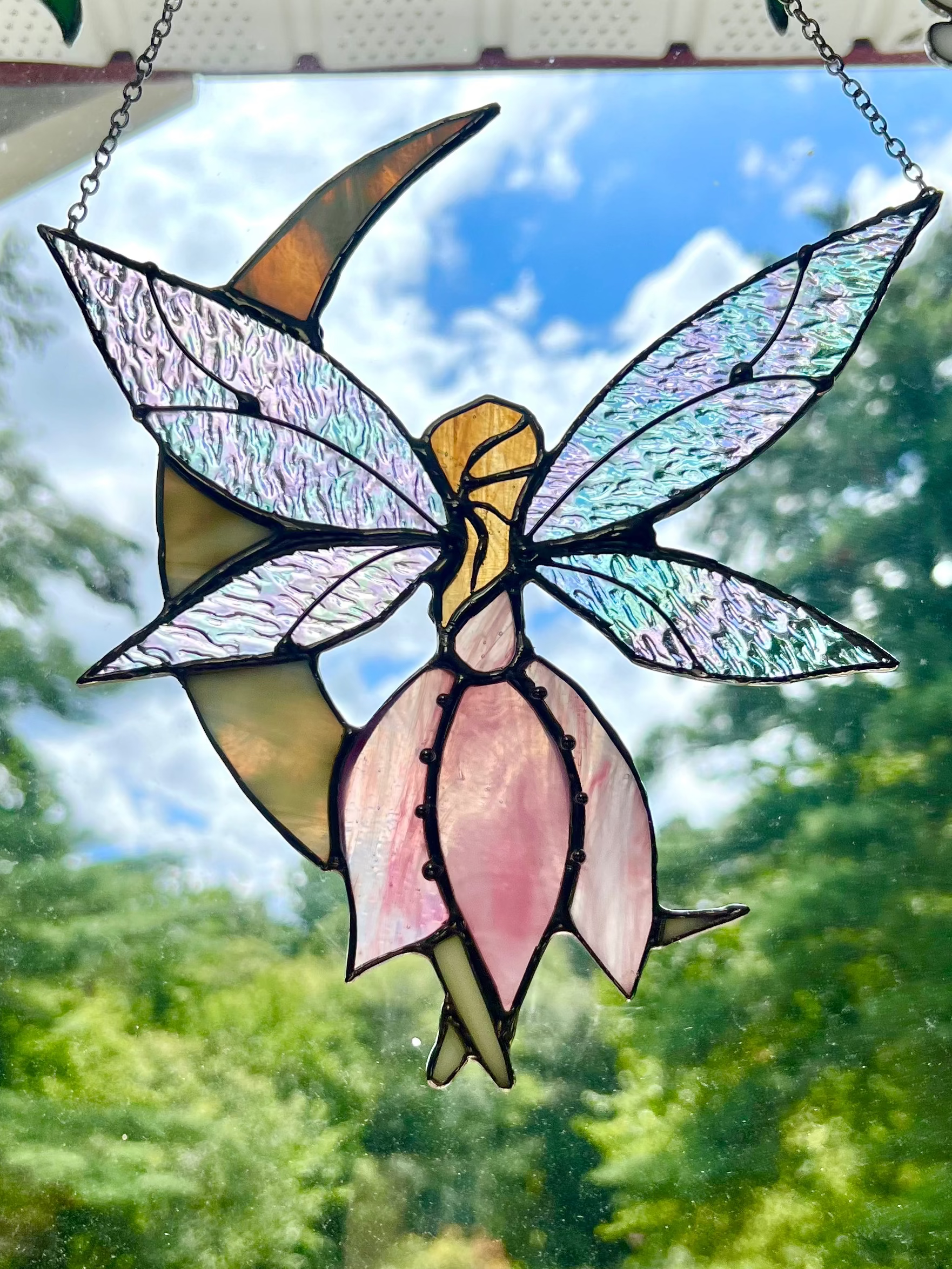 This sweet little fairy will add a little magic to any window. Made with mottled white glass for the moon, and iridescent glass for her wings. Her petal dress is pink wispy glass.