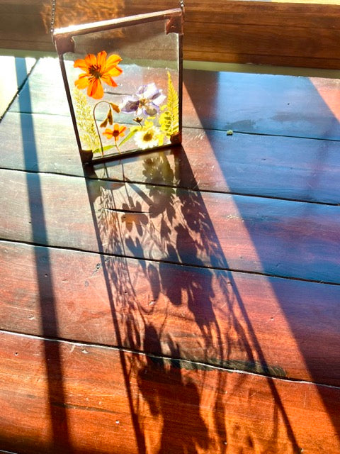 Stained Glass Pressed Flower Panel made with real, carefully pressed garden flowers in between two sheets of glass. Approximately 6"x4.5"